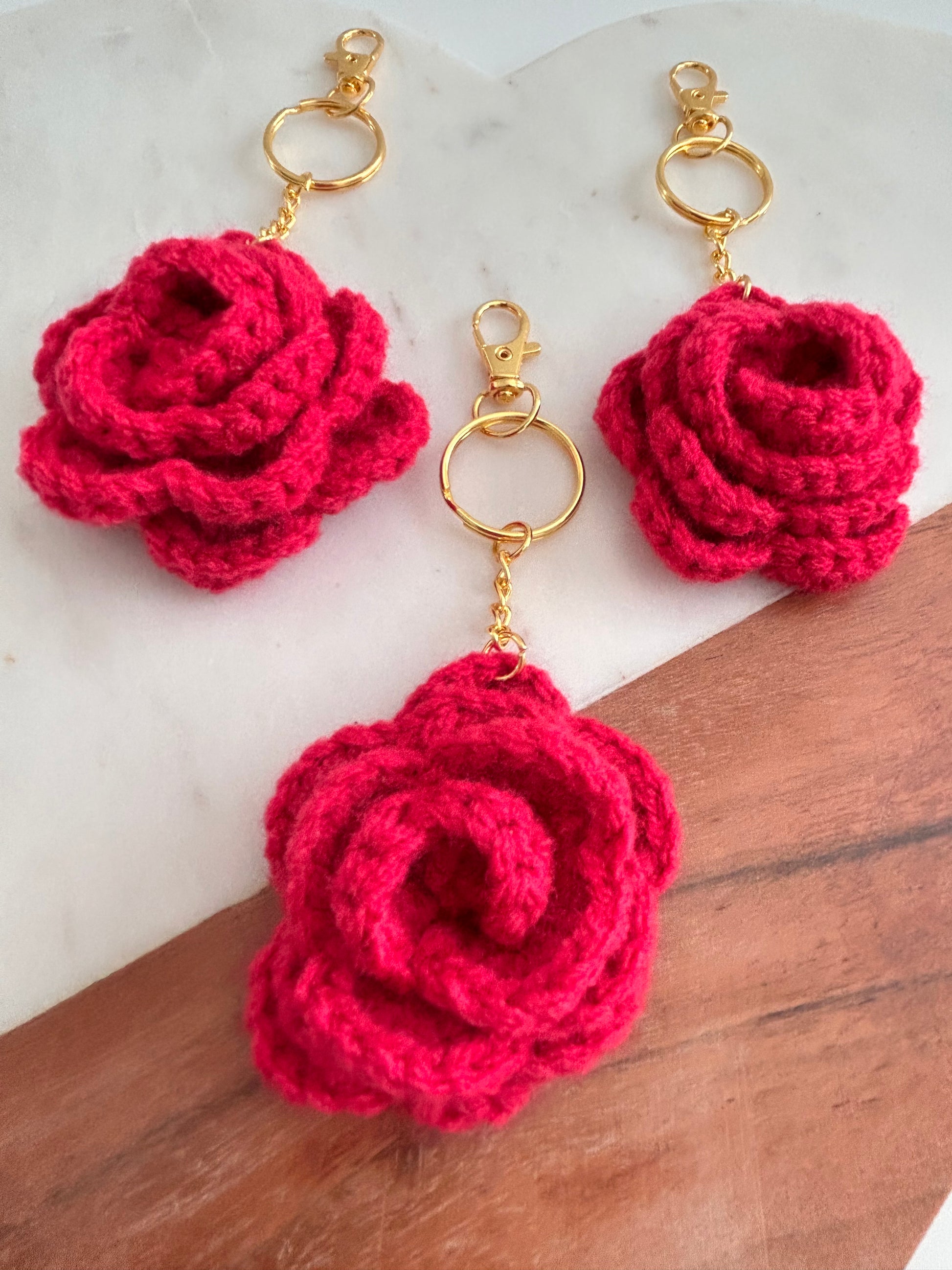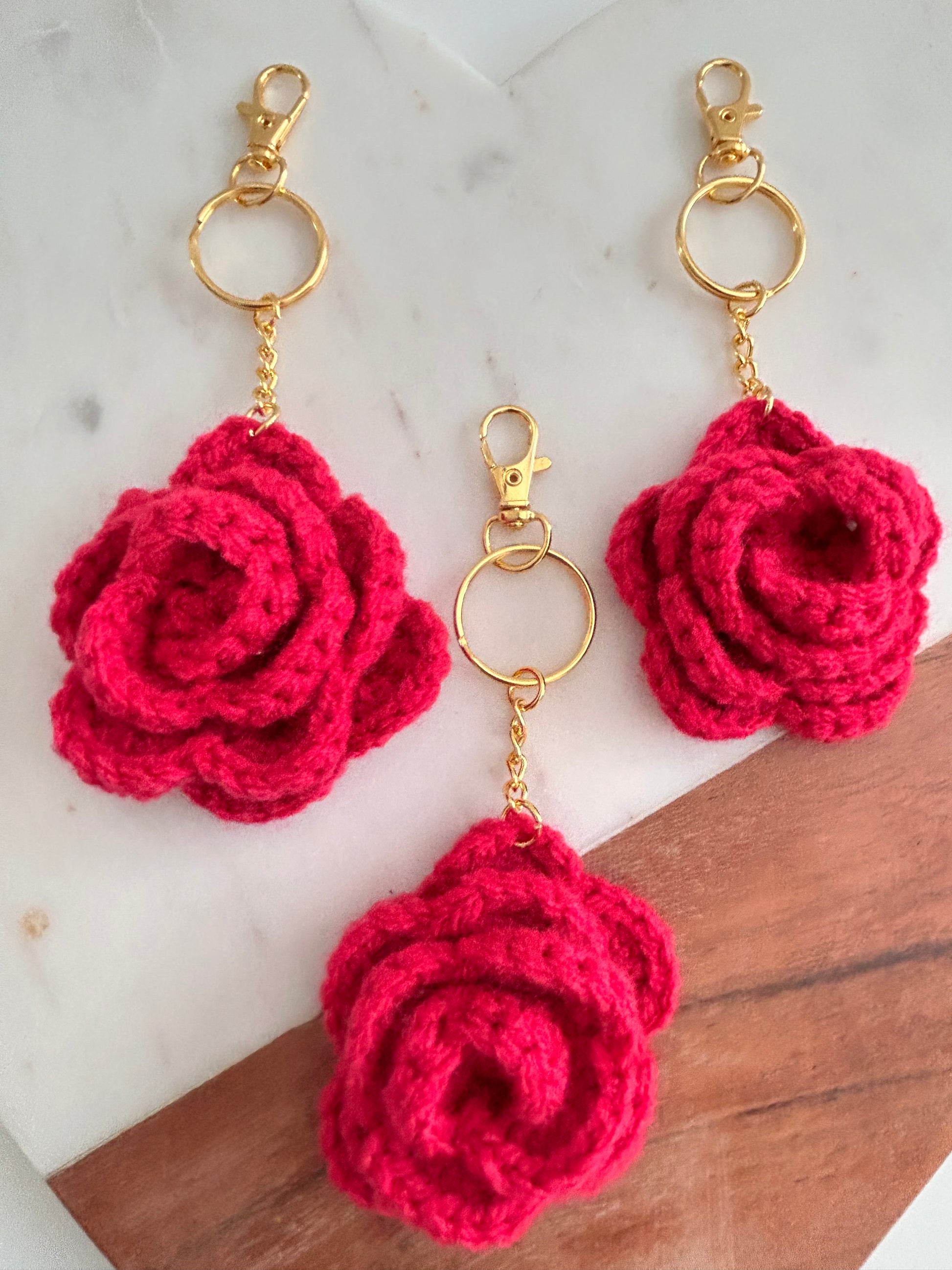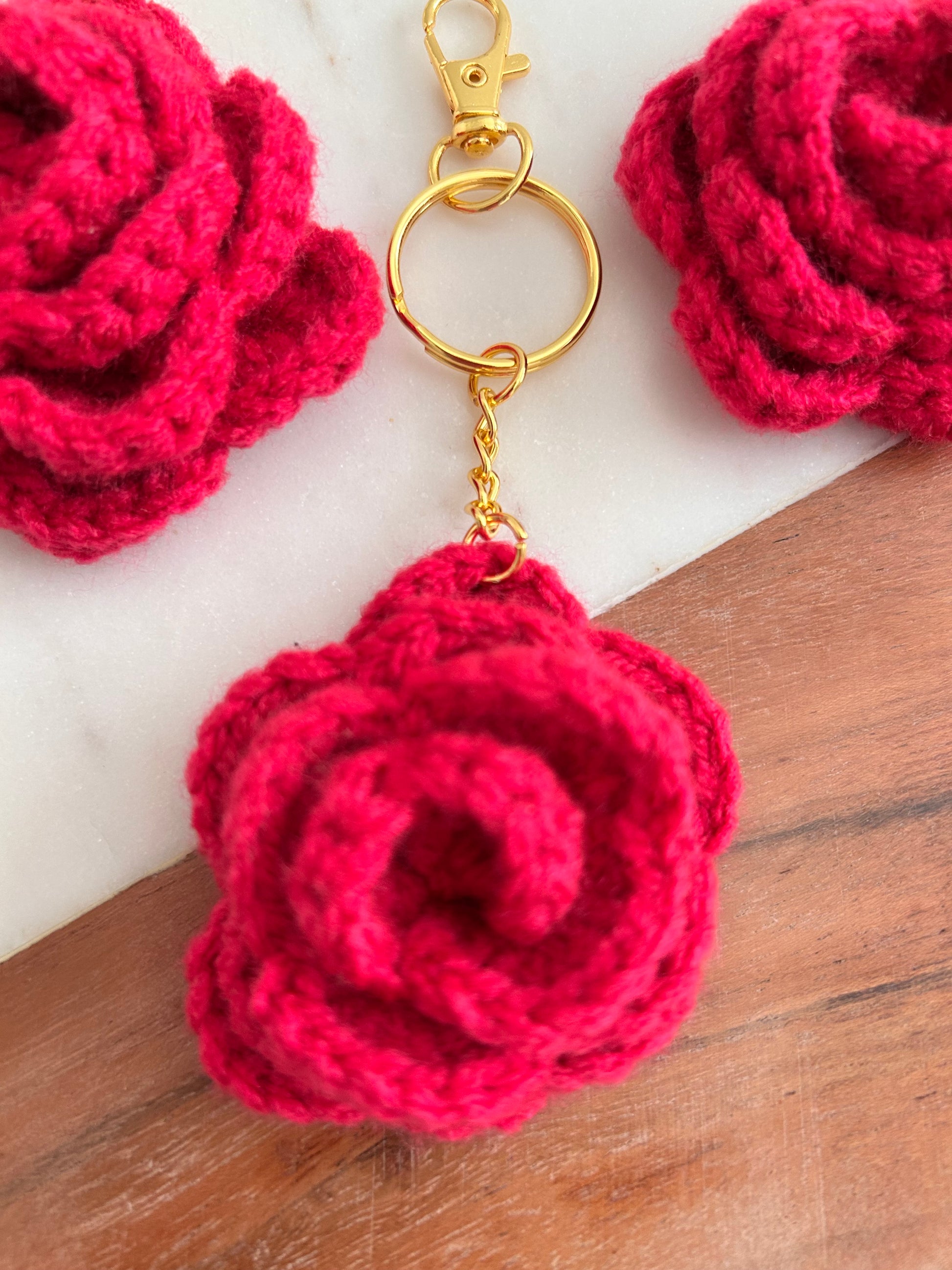 Purchase is for 1 Crochet Rose Keychain/Bag Charm. Charm includes gold key ring and lobster clap.