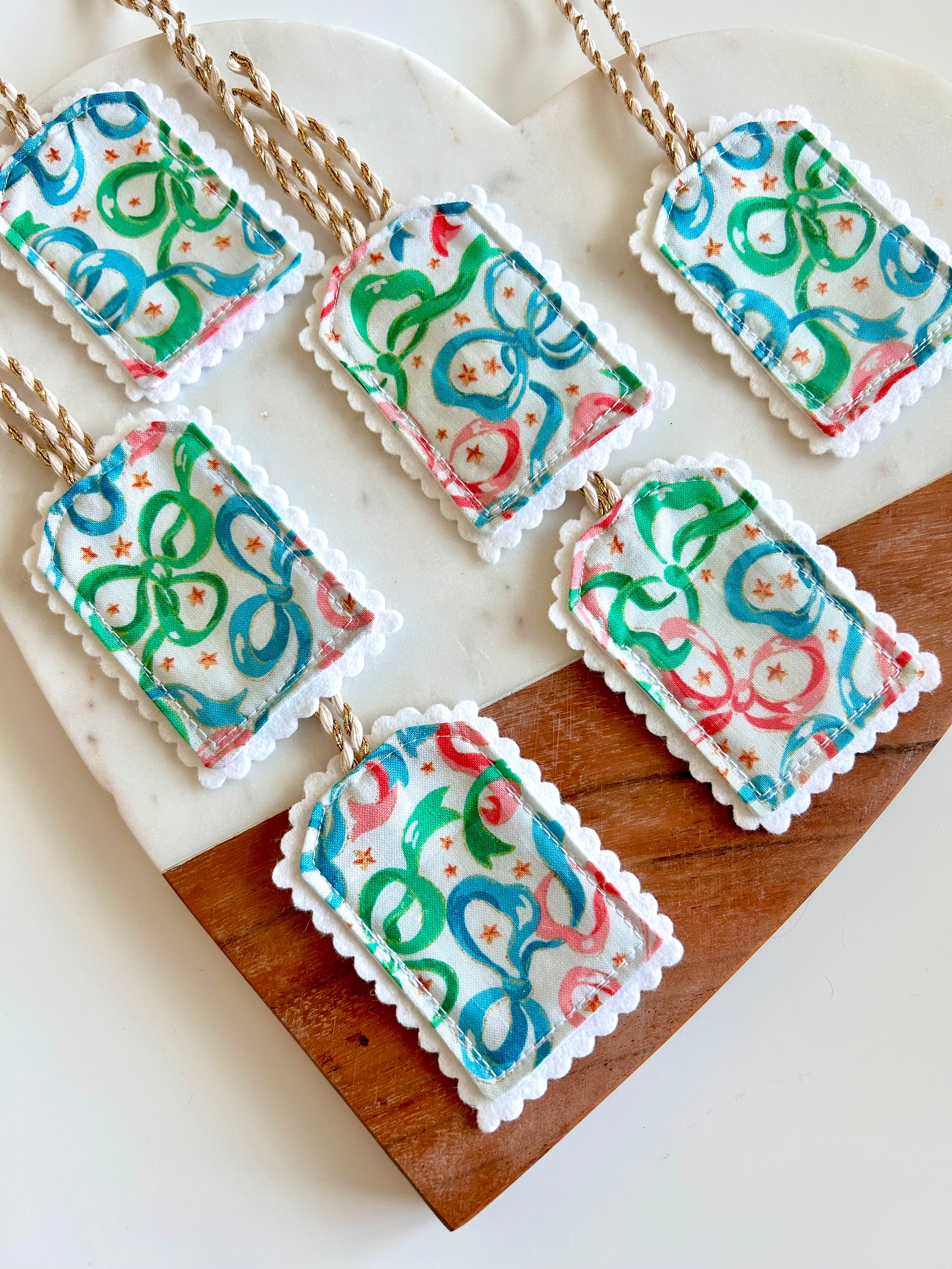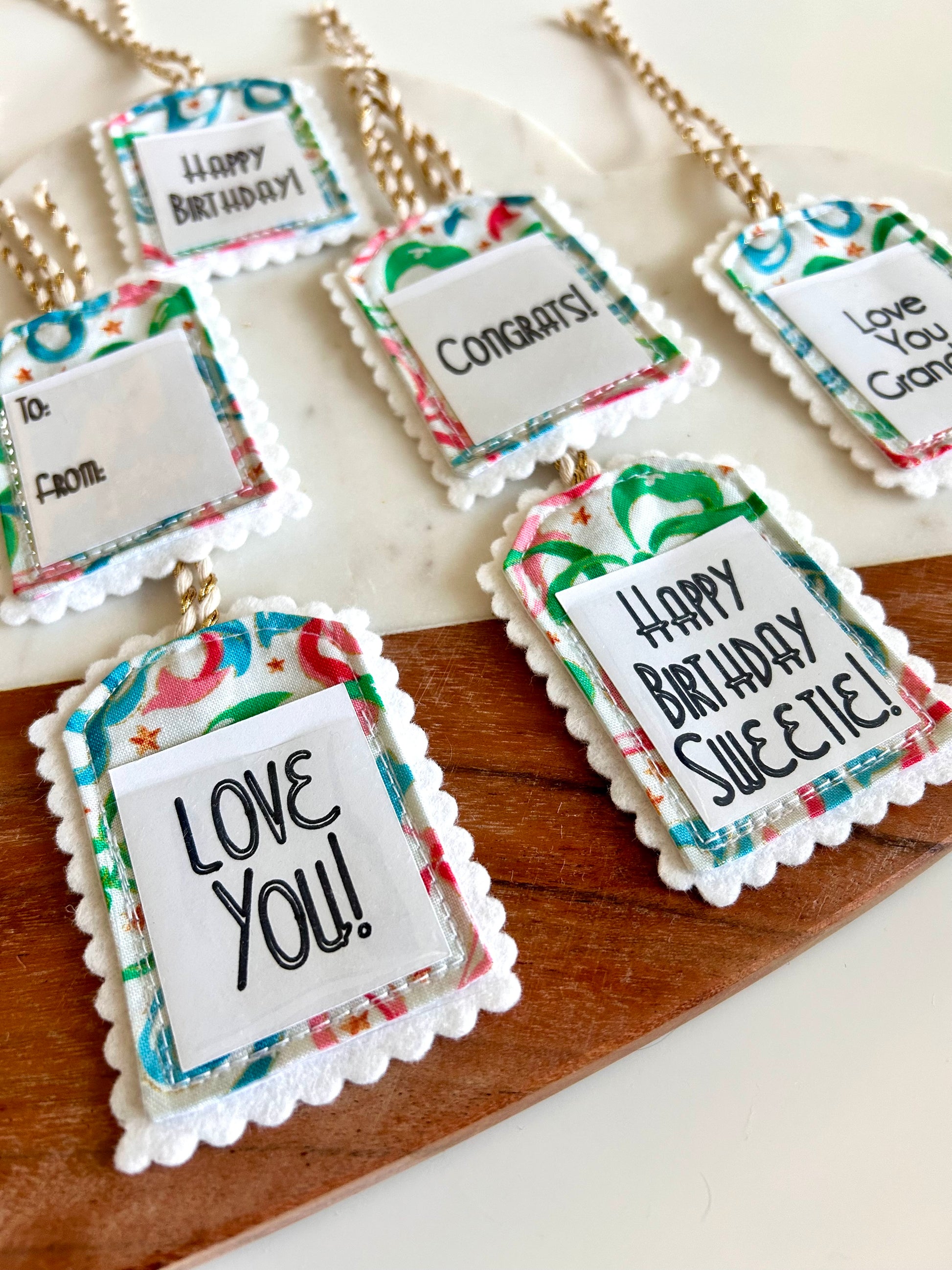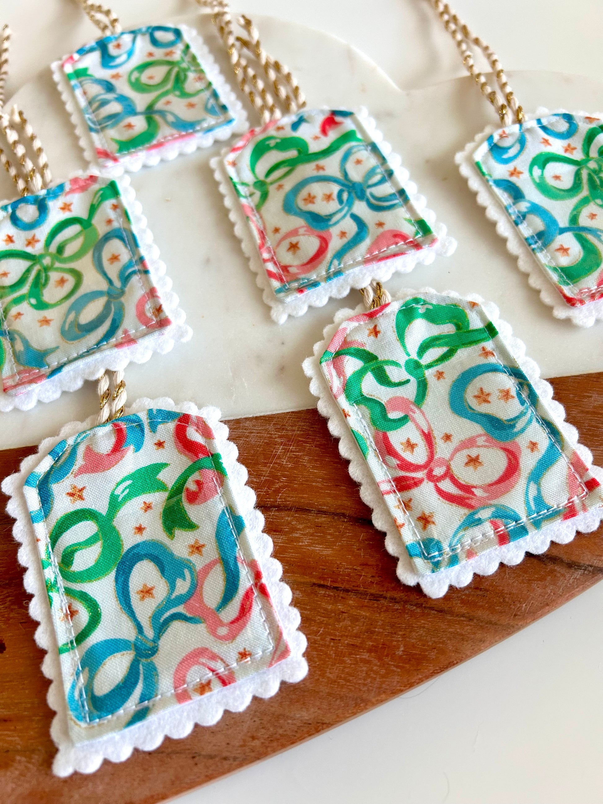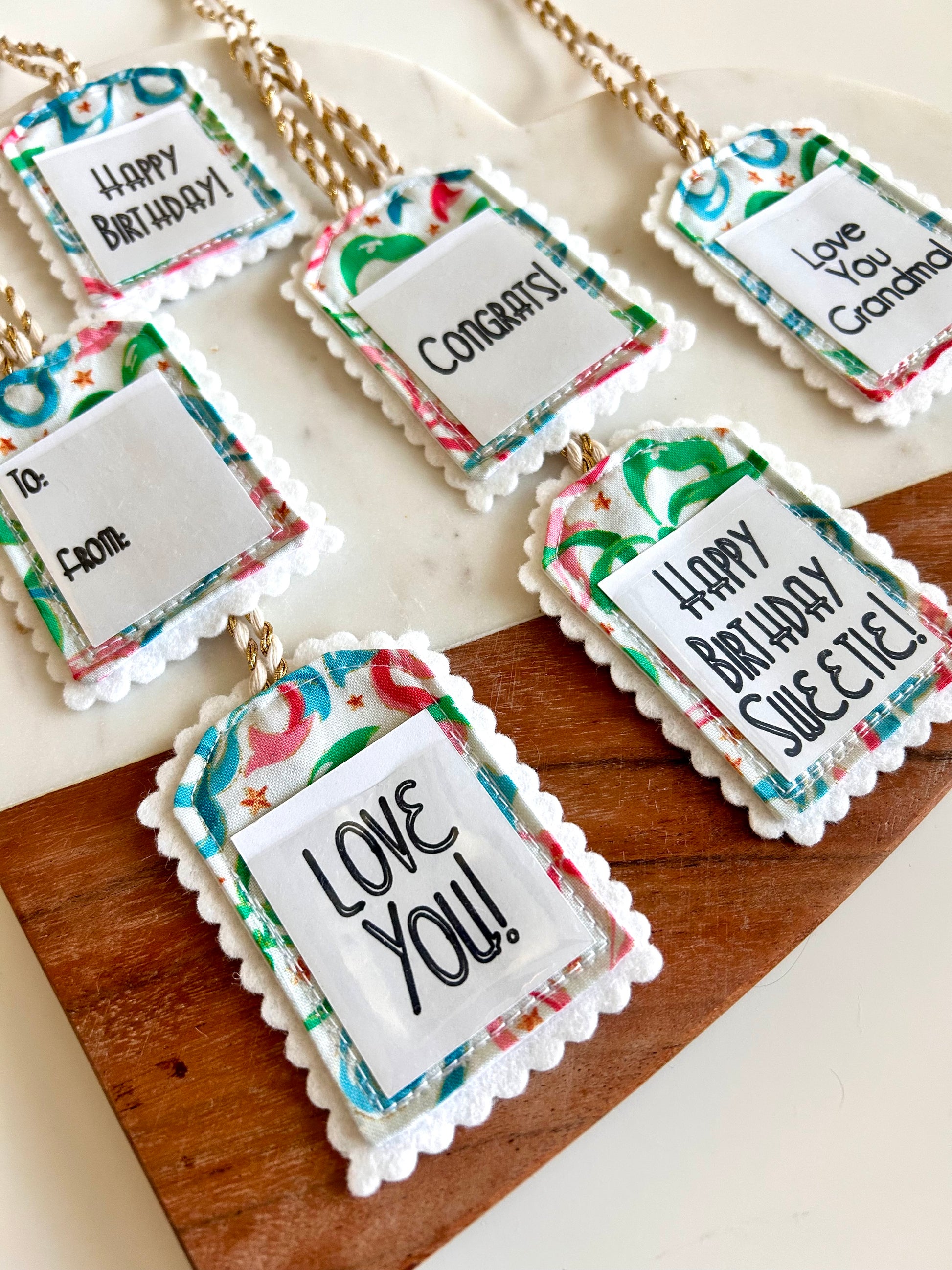 Gift tags are made with cotton fabric, vinyl and wool blend felt. Wool blend felt is resistant to pilling and maintains it's beautiful texture, strength and durability. Cord ends are sealed to keep from fraying. Each item is handmade and stitched with love and attention to detail. Items are uniquely made and slight variation may occur.