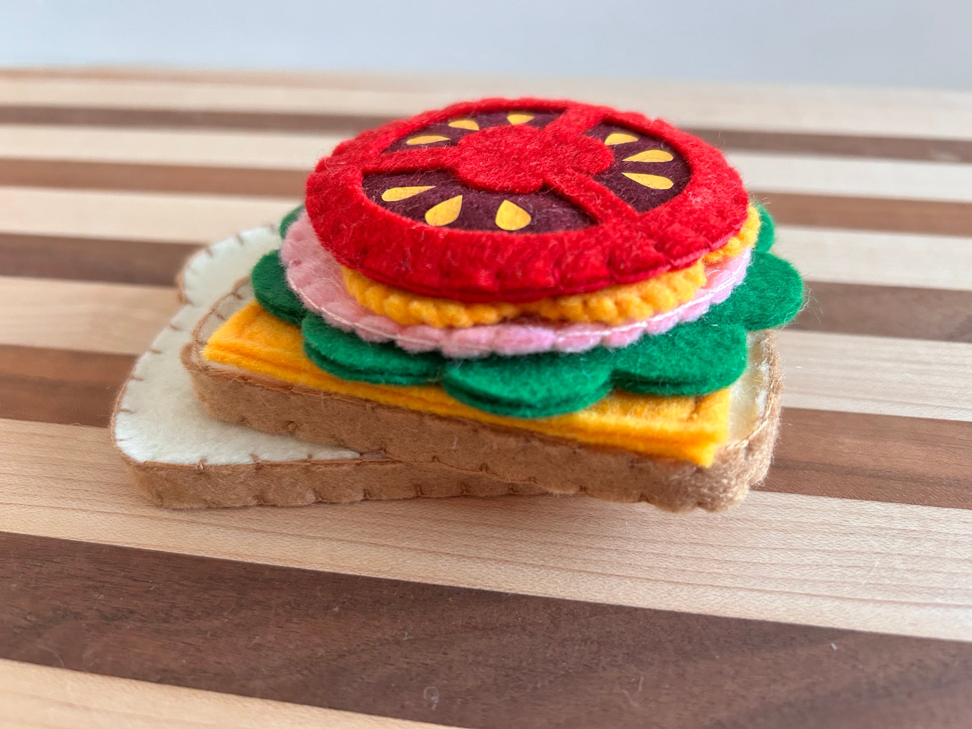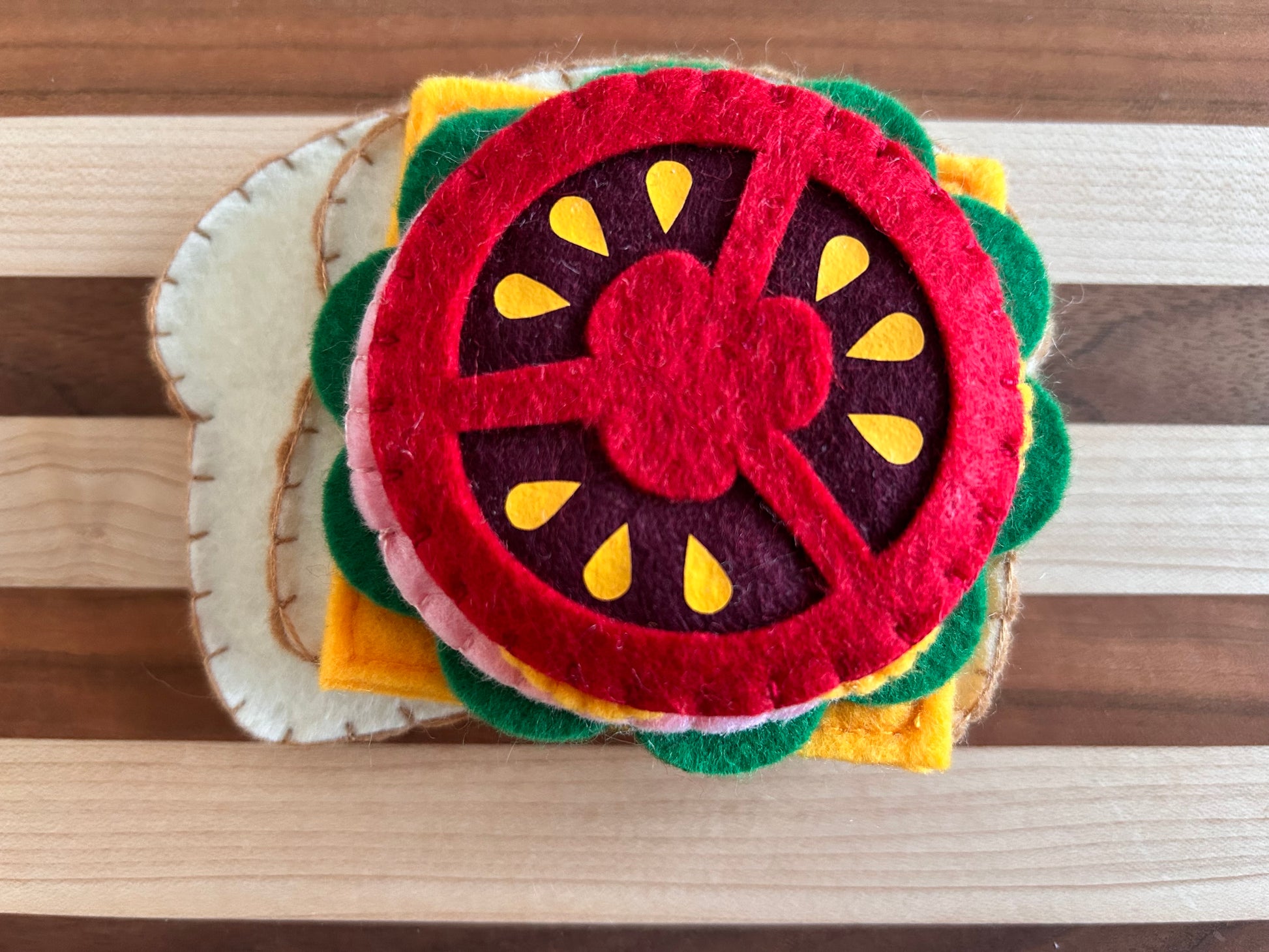 The sandwich is made with a combination of wool blend felt and eco felt. Wool blend felt is resistant to pilling and maintains it's beautiful texture, strength and durability. Each item is handmade and stitched with love and attention to detail. Items are uniquely made and slight variation may occur.