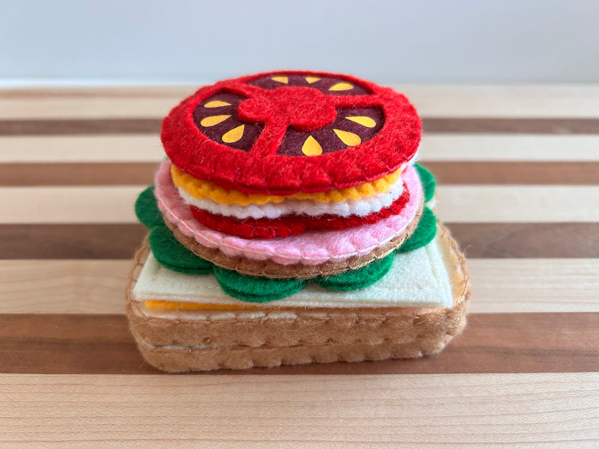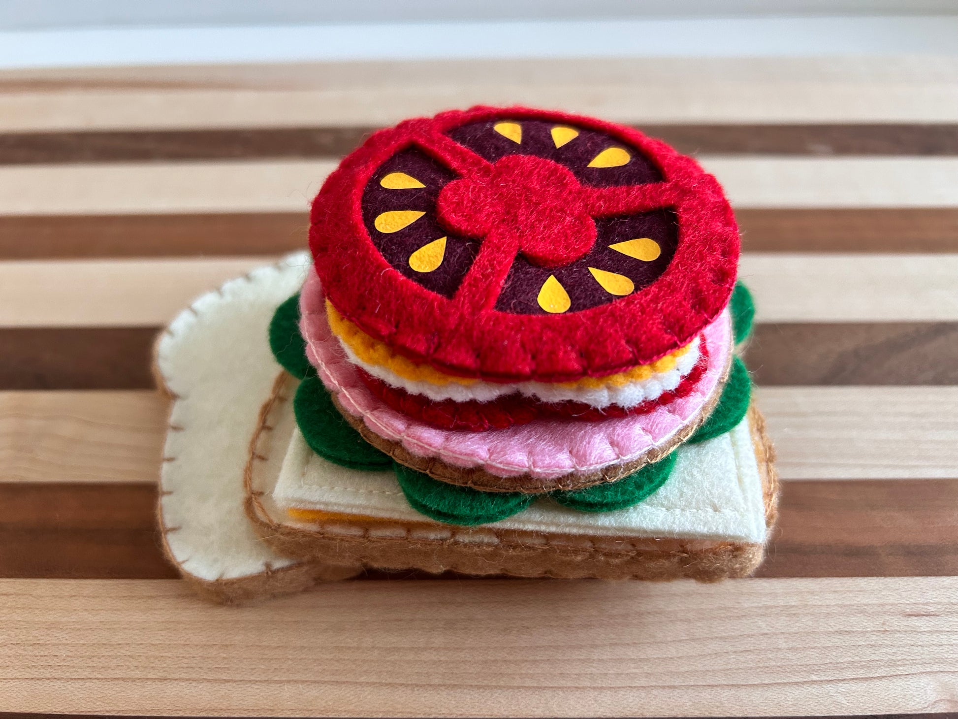 The sandwich is made with a combination of wool blend felt and eco felt. Wool blend felt is resistant to pilling and maintains it's beautiful texture, strength and durability. Each item is handmade and stitched with love and attention to detail. Items are uniquely made and slight variation may occur.