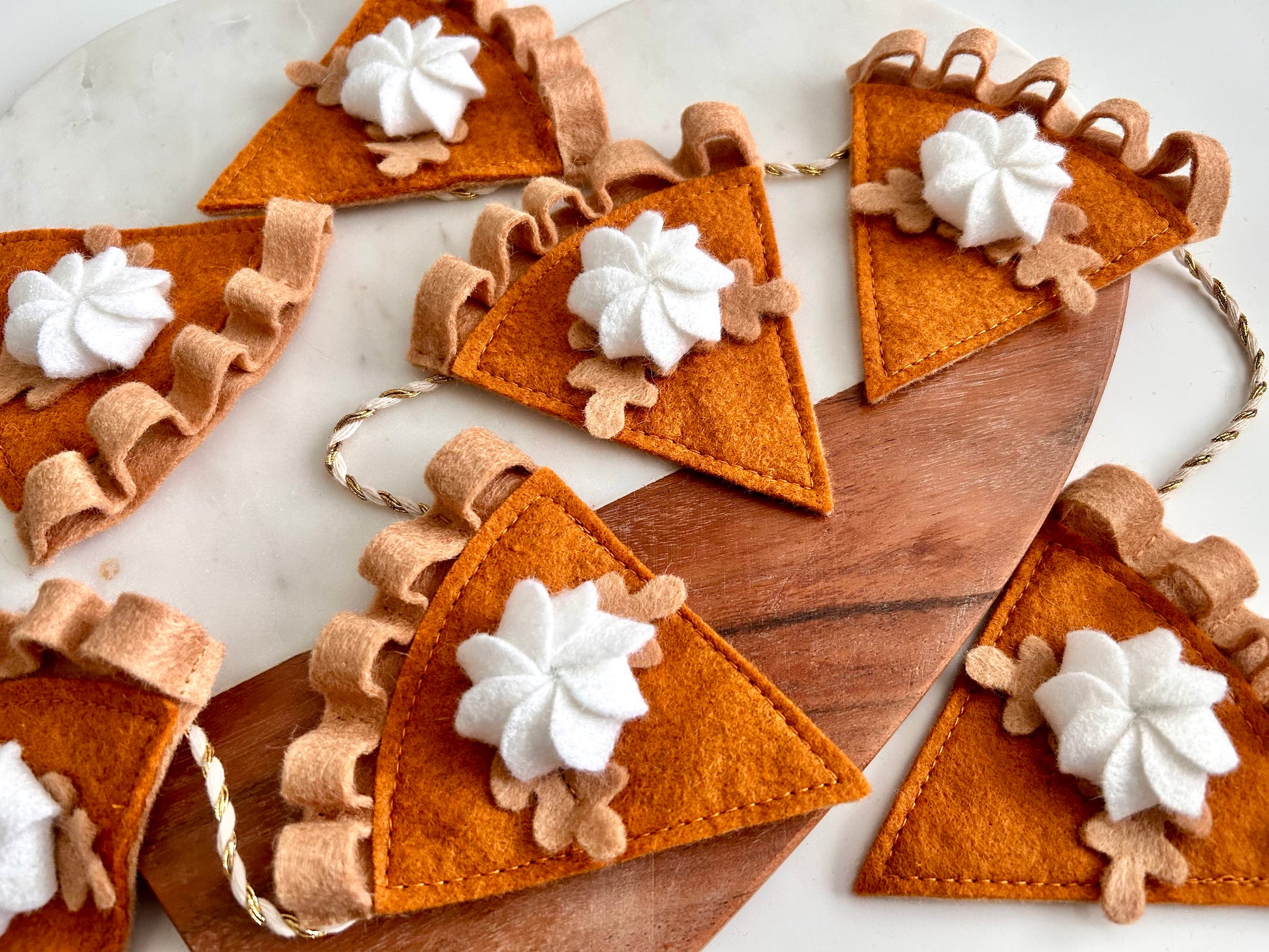 Pumpkin Pie slices are made wool blend felt. Wool blend felt is resistant to pilling and maintains its beautiful texture, strength and durability. Each item is stitched with love and attention to detail. Items are uniquely made and slight variation may occur.