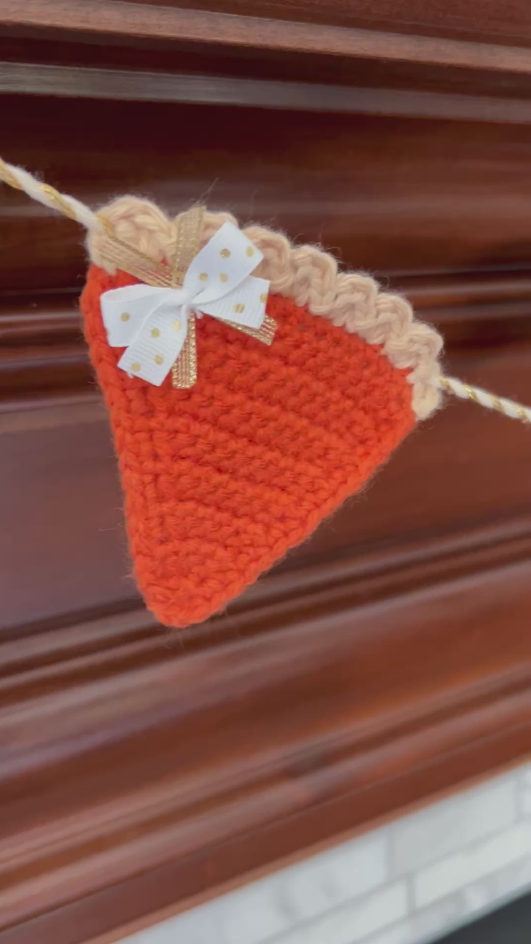 String these cute pumpkin slices along your fireplace, mirror, end of a bed, in your office or anywhere you want to celebrate the season. Pumpkin pie garland has 8 pie slices strung on a beautiful gold and ivory cord. Each pie slice has a decorative bow on it. Pie slices can easily slide along cord to fit your design space. Cord length is approximately 5 1/3 feet long.