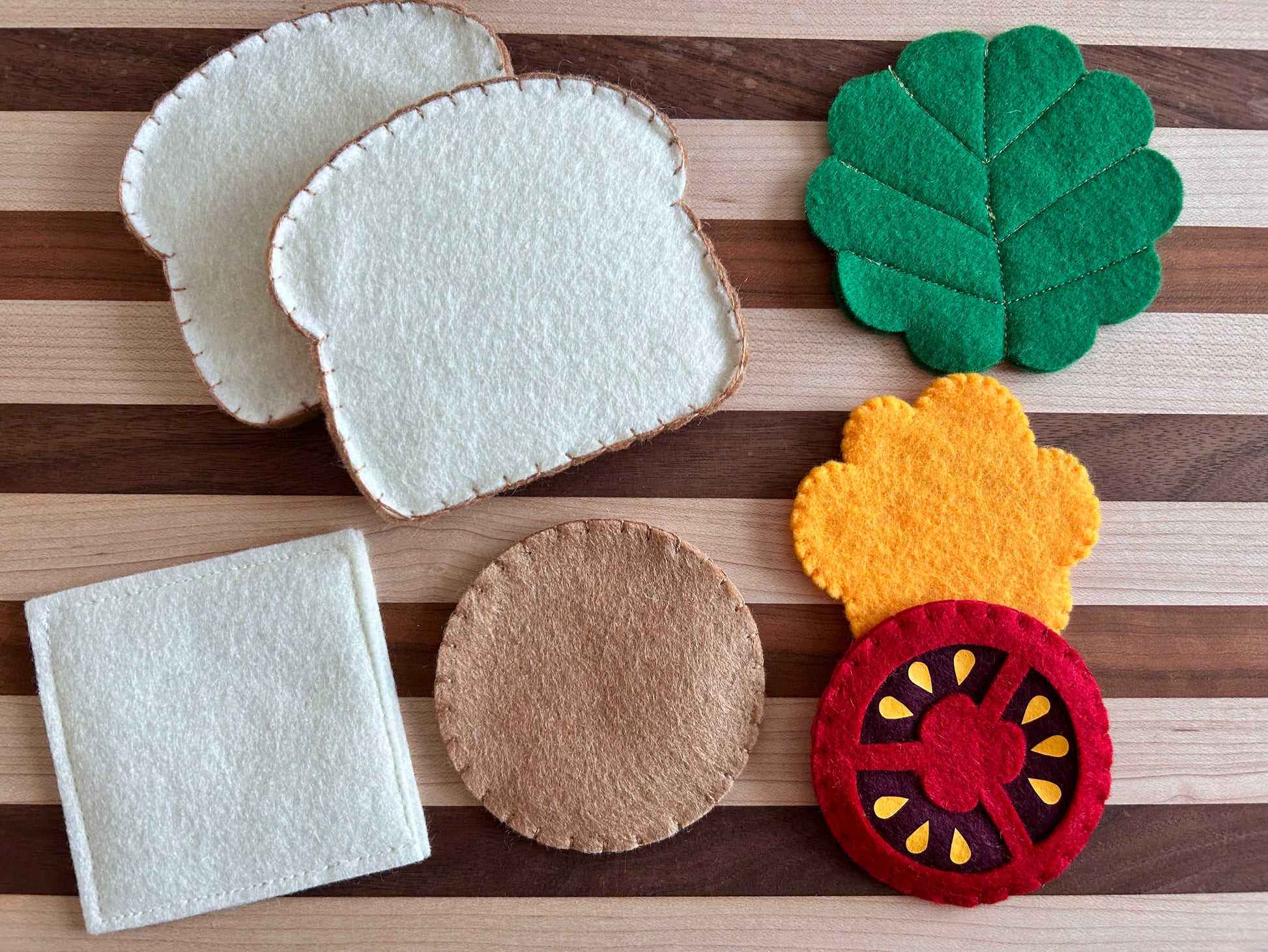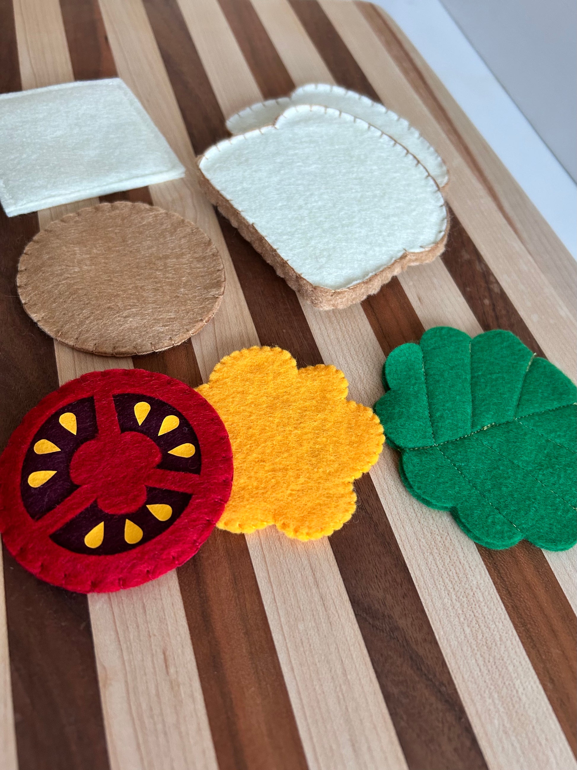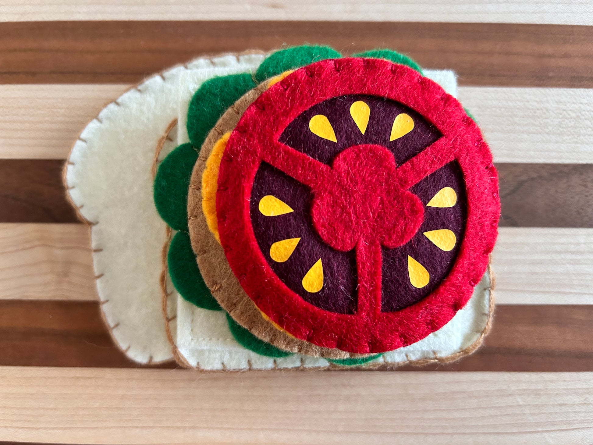 The sandwich is made with a combination of wool blend felt and eco felt. Wool blend felt is resistant to pilling and maintains it's beautiful texture, strength and durability. Each item is handmade and stitched with love and attention to detail. Items are uniquely made and slight variation may occur.